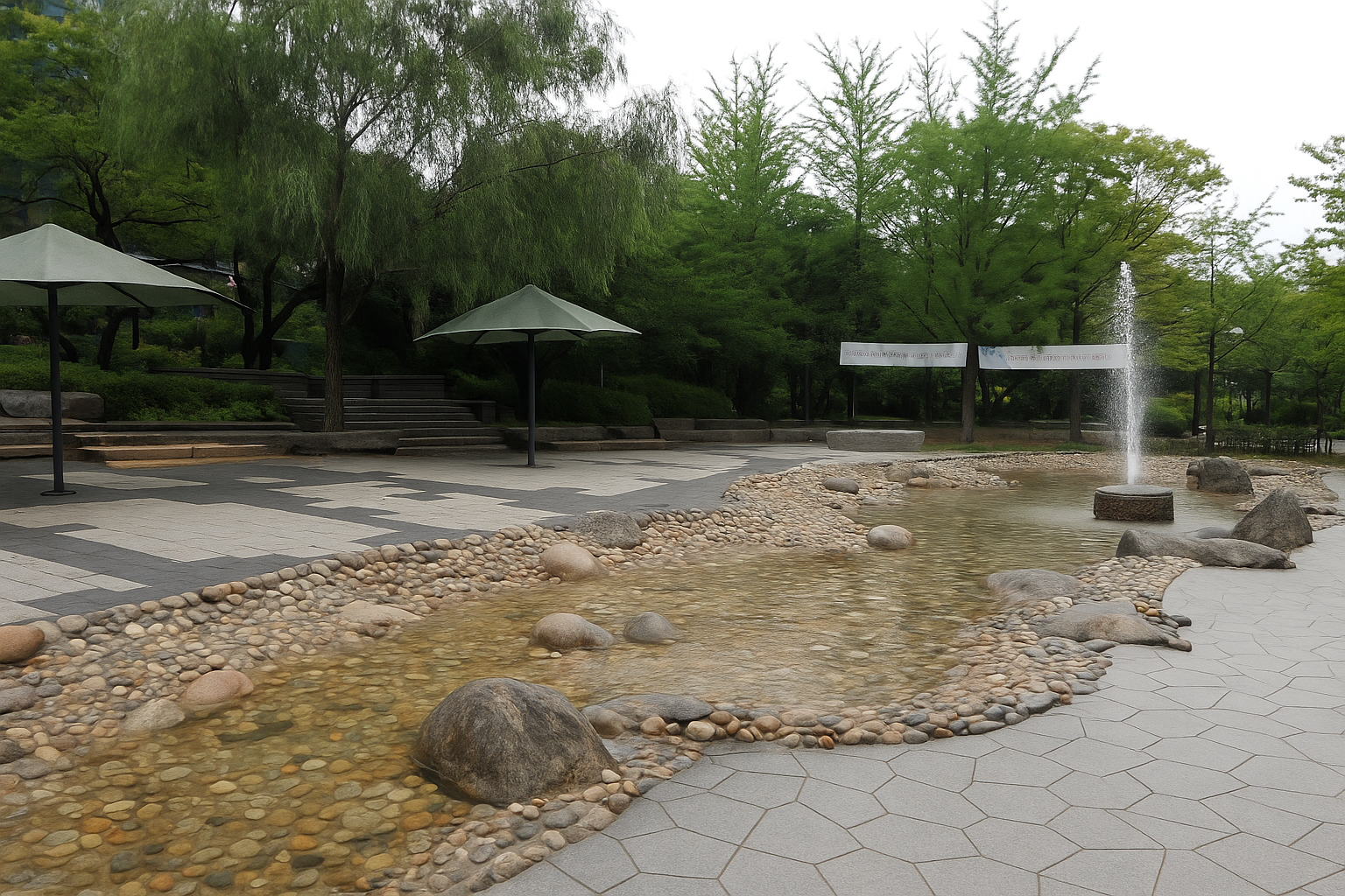 작은 분수와 물길 놀이가 어우러진 자연 친화형 공간이에요.