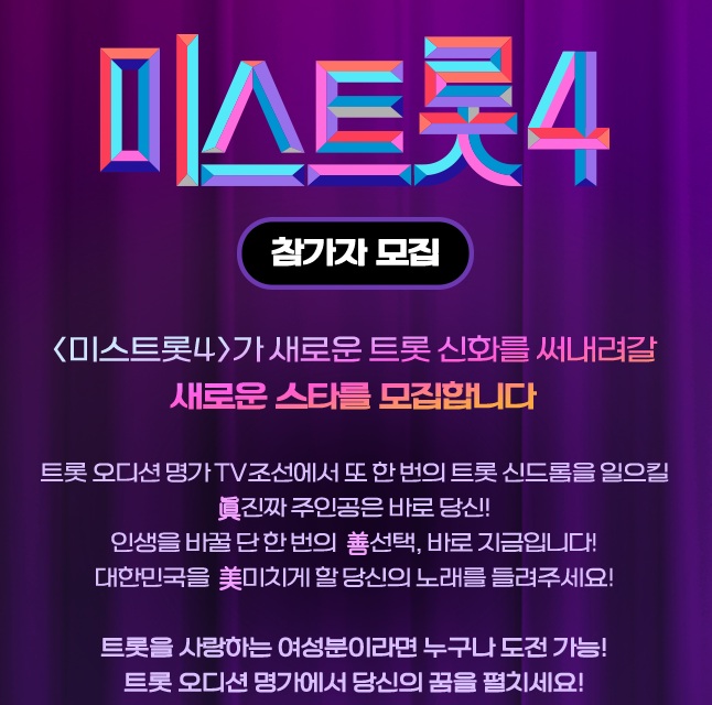 TV조선의 간판 오디션 프로그램 ‘미스트롯’이 네 번째 시즌으로 돌아옵니다.