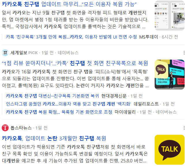 결국 “국민 메신저는 국민 메신저답게 써야 한다”는 요구가 압도적인 공감대를 형성했고, 카카오는 개편 엿새 만에 ‘되돌리겠다’는 입장을 밝히게 됩니다.