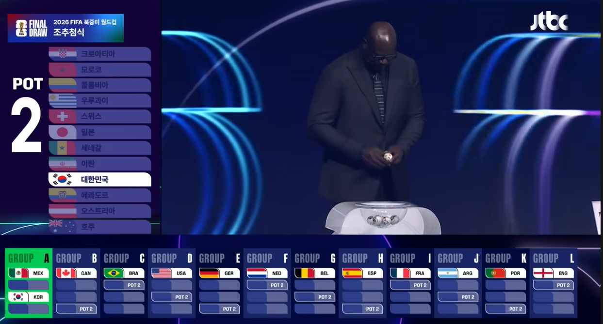 12월 6일(한국 시간) 미국 워싱턴 DC 케네디센터에서 열린 조추첨 결과, 한국은 개최국 멕시코와 함께 A조에 편성됐습니다. 포트 2에서 사상 첫 배정을 받은 만큼, 출발은 나쁘지 않은 편이에요.